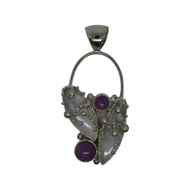 Elegant sterling silver pendant featuring luminous mother of pearl panels accented with rich purple amethyst s…